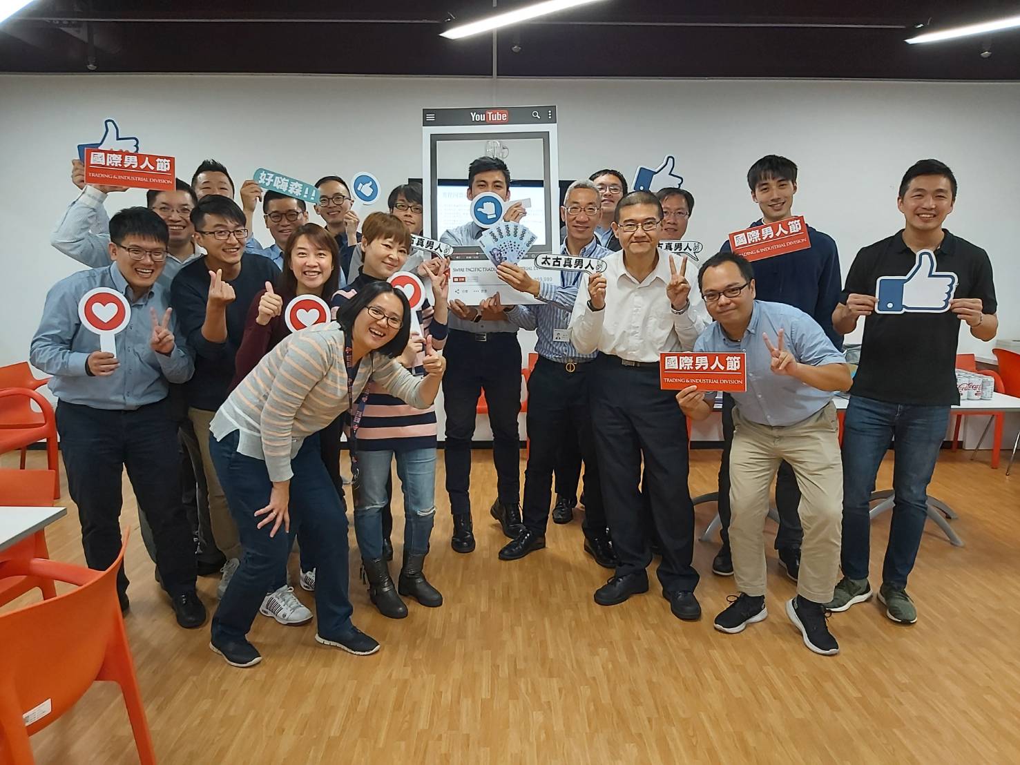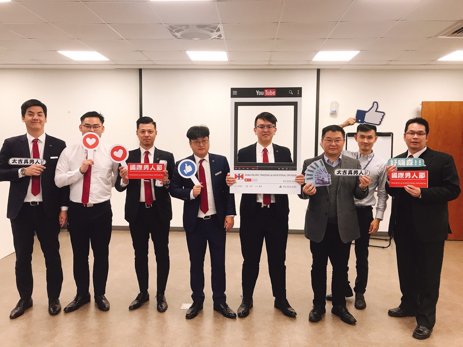 11月19日當天,貿易及實業部門首度熱鬧非凡的舉辦了「國際男人節」活動,兩岸三地皆共襄盛舉,本次活動主題強調以身作則-Men Leading by Example,除了精心製作的宣傳物品外,活動的策劃更是出奇致勝,相當多元!太古汽車集團北、中、南各區皆響應舉辦活動,一開始先播放歷經一段時日、嘔心瀝血製播的多元共融影片,接著各區長官簡短活動致詞後,隨即展開緊張刺激的小型趣味競賽。男性同仁奮力的接棒挑戰吸管喝可樂、跳繩20下、伏地挺身10下活動,三個項目陸續完成後,時間相較於其他五組成員最短的組別,即獲得該區的優勝及頒發獎勵金。