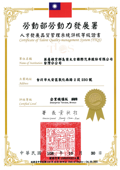 TTQS就是如同ISO一樣的認證,共分5個等級:不通過、通過、銅牌、銀牌及金牌。而太古汽車做好準備並於2019年提出申請評核,便獲得了銅牌的佳績!據評核單位表示,這是難得少見的優異表現!代表著太古汽車的辦訓品質及人才發展體系相當良好!在此感謝各事業單位主管對公司教育訓練的一路支持與對人才發展的重視,也期待我們未來能再創佳績!