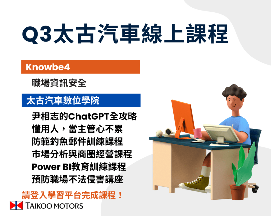 工作生活 【活動回顧】International Automobile Ltd. 攜手參與 Pink Friday2025-11-25 每個人都值得驕傲,今年的Pink Friday活動... 【課程回顧】健康促進-身體動作篩檢暨運動傷害自我處理課程2025-11-25 這次健康促進課程邀請物理治療師-... 耶誕禮盒愛心活動2025-11-25 在太古集團慈善信託基金(太古基金)的支持與推動下... 【課程回顧】TMG高潛力人才與中階主管訓練2025-11-20 太古汽車近期辦理「領導管理:制定決策與執行力」課程... 【課程回顧】2025 Q4 核心價值工作坊2025-11-20 為協助新進同仁深入了解企業文化與核心價值,... 【課程回顧】當責與執行力課程2025-11-18 本次訓練課程以「強化管理心態」為核心,聚焦於個人與團隊的當責。... 【課程回顧】理性的決策思考2025-11-18 本次領導力訓練課程聚焦於「決策力的培養與實踐」... 【課程回顧】財務分析與規劃課程2025-10-23 年度的財務知識課程又來了,這次課程規劃讓各單位... 太古汽車祝大家中秋節快樂2025-10-17 太古汽車誠摯祝福您:中秋佳節平安順心、闔家團圓!... 太古汽車 X 國立虎尾科技大學2025-10-17 太古汽車深耕校園人才培育已超過十年,一路陪伴年輕學子成長... 太古汽車中秋校園拜訪2025-10-17 太古汽車中秋校園拜訪 適逢中秋佳節,我們前往多... 父親節問卷調查2025-09-12 太古汽車父親節問卷調查結果... 【課程回顧】初階內部講師訓練2025-09-03 太古汽車一年一度的初階內部講師訓練圓滿落幕!... 【課程回顧】太古達人培訓學程-市場分析與商圈經營課程2025-09-03 太古汽車本次為銷售同仁開設市場分析與商圈經營課程,透過數位工具強... 【活動回顧】中區-社群讀書會2025-08-29 在這次《原子習慣》的共讀裡,大家分享了許多深刻的體會... 太古汽車祝福同仁父親節快樂2025-08-11 親愛的同仁們,您好:在這個充滿感恩與溫馨的日子裡,太古汽車向... 【數位課程上架公告】Q3太古汽車線上課程2025-08-11 以下課程已於Q3上線囉!請同仁於指定期限內完成相關課程,歡迎有興趣的夥伴立即上線學習... 【訓練回顧】焦點工作坊(北部場)2025-08-11 太古汽車在今年八月於北部舉辦兩場焦點工作坊,... 榮耀時刻|太古汽車榮獲 2025 亞洲最佳雇主獎等三項大獎2025-08-11 榮耀時刻|太古汽車榮獲 2025 亞洲最佳雇主獎等三項大獎... 【活動回顧】114學年度台中市青年高中僑生建教班招募活動2025-07-30 🚛2025/07/29【114學年度台中市青年高中僑生建教班招募活動】... Load More